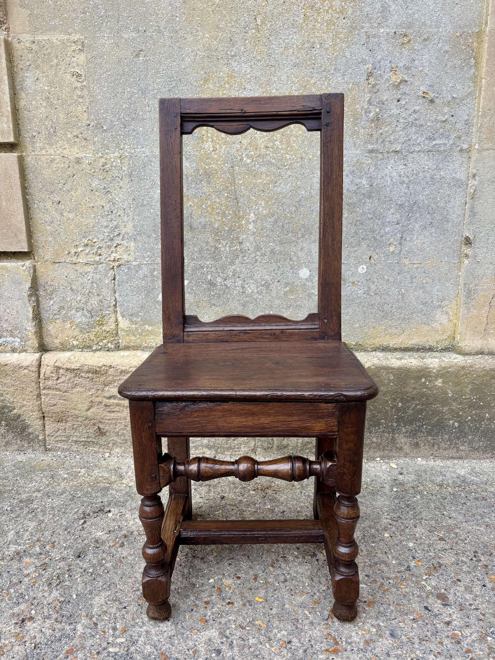 The chair has a seat height of 41cm, with an overall seat length of 39cm and depth of 39cm. It shows the charming irregularities expected of age, including some movement in the joints, light distortion, and traces of historic woodworm (long since treated). The surface has developed a rich, well-worn patina, adding depth and character.