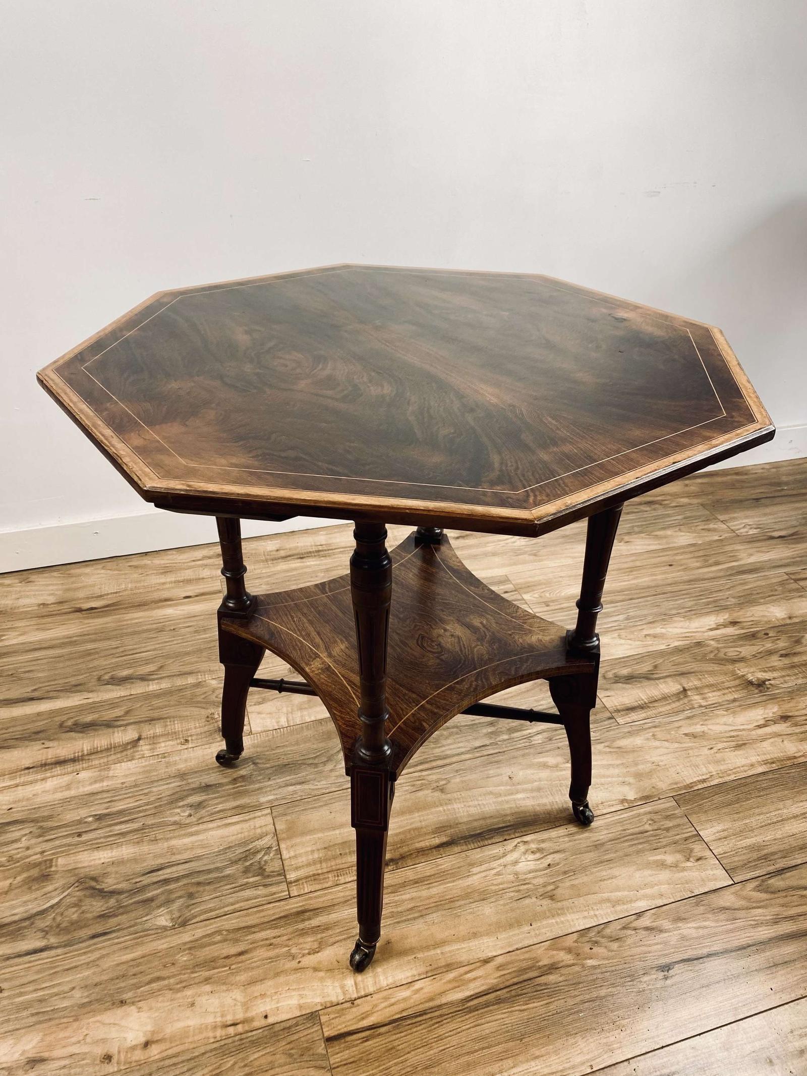 A late 19th Century antique rosewood aesthetic movement inlaid octagonal occasional or library table, with lower shelf and cross stretchers. Possible by lamb of Manchester or Jas Schoolbred.