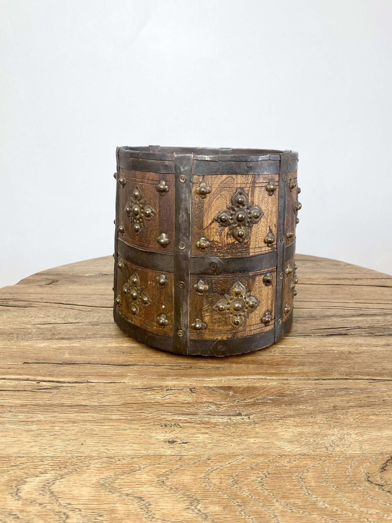 This antique Indian grain measure dates to the 19th century and is over 100 years old. This style is most often from Rajasthan in Northern India and is constructed from teak wood and iron. Grain measures like these were used in markets for measuring wheat, corn, rice, and pulses. In the old days, the Indian measures were Seers & Pattis.