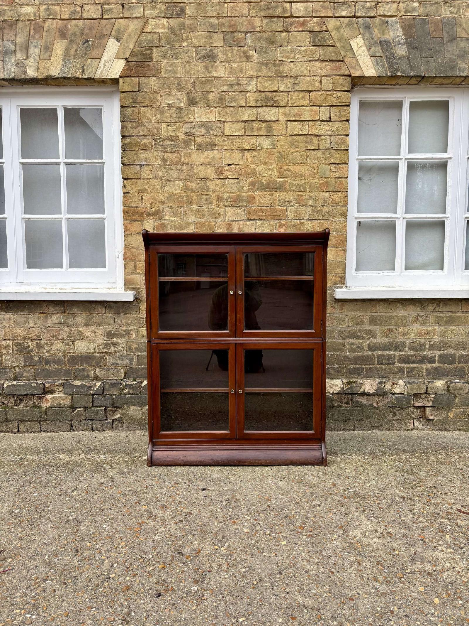 A charming late Victorian mahogany glazed bookcase that separates neatly into two sections for easy movement and placement. Each half is fitted with a pair of glazed panel doors and retains its original brass pull knobs.
