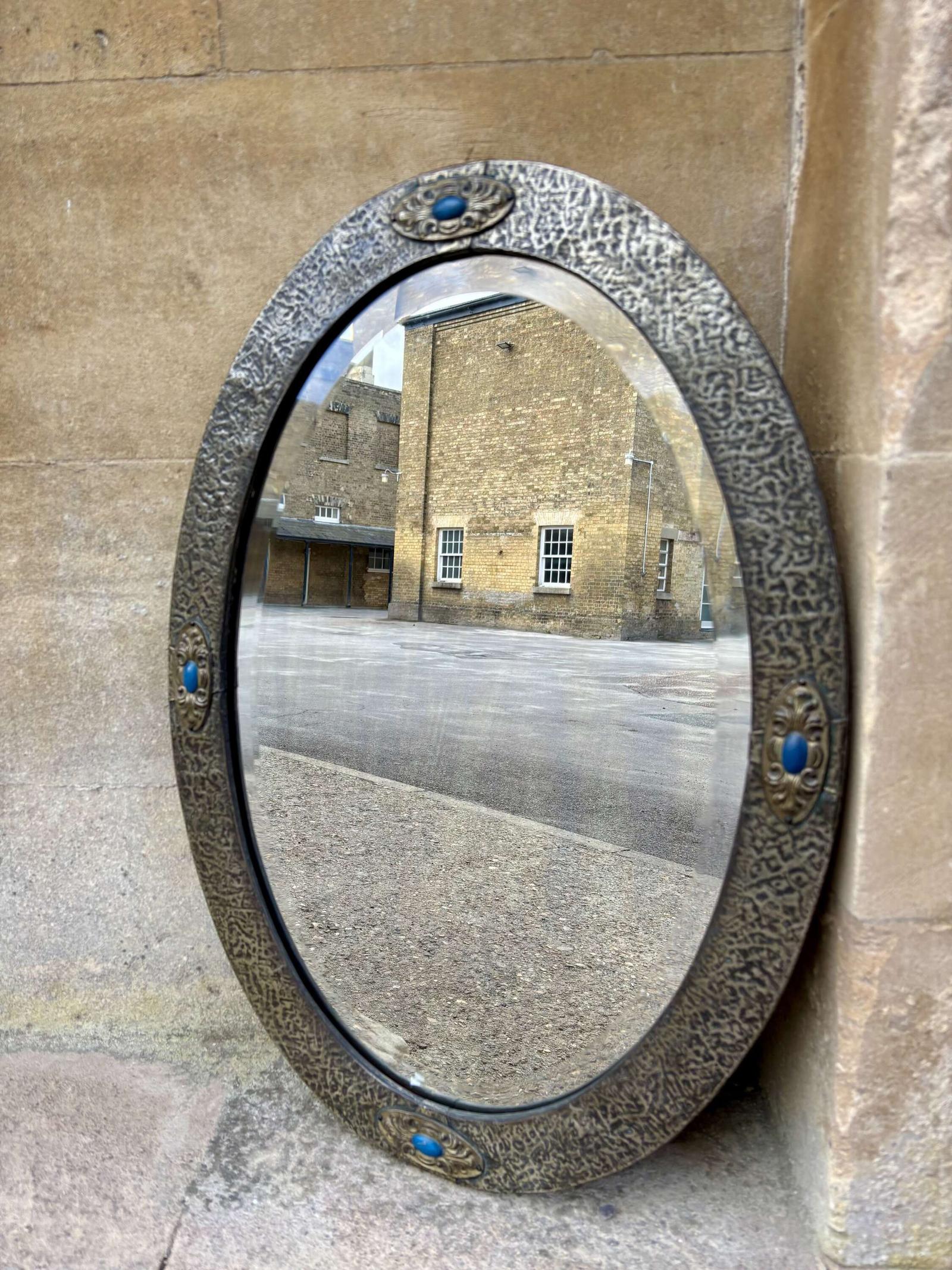 An elegant oval wall mirror set in a decorative hammered metal frame, embellished with inset cabochon-style blue stones at the compass points.