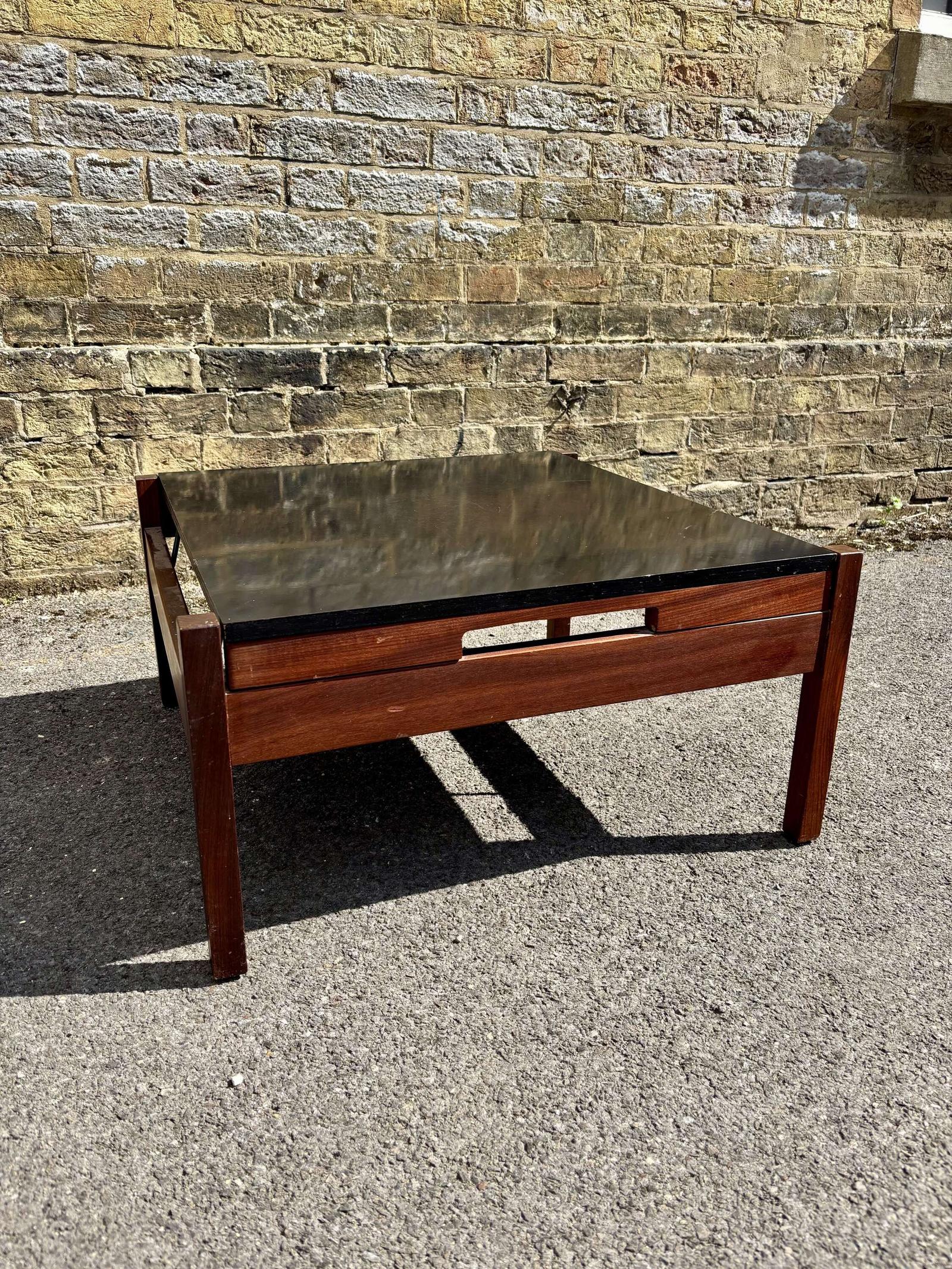 A stylish mid-century piece by renowned British maker Guy Rogers, dating from the 1960s/1970s. Designed with clean, modernist lines, it features a rich teak frame with simple squared legs and a sleek black top surface. Originally intended as a dual-purpose piece, it works equally well as a compact coffee table or as a footstool with a loose cushion.