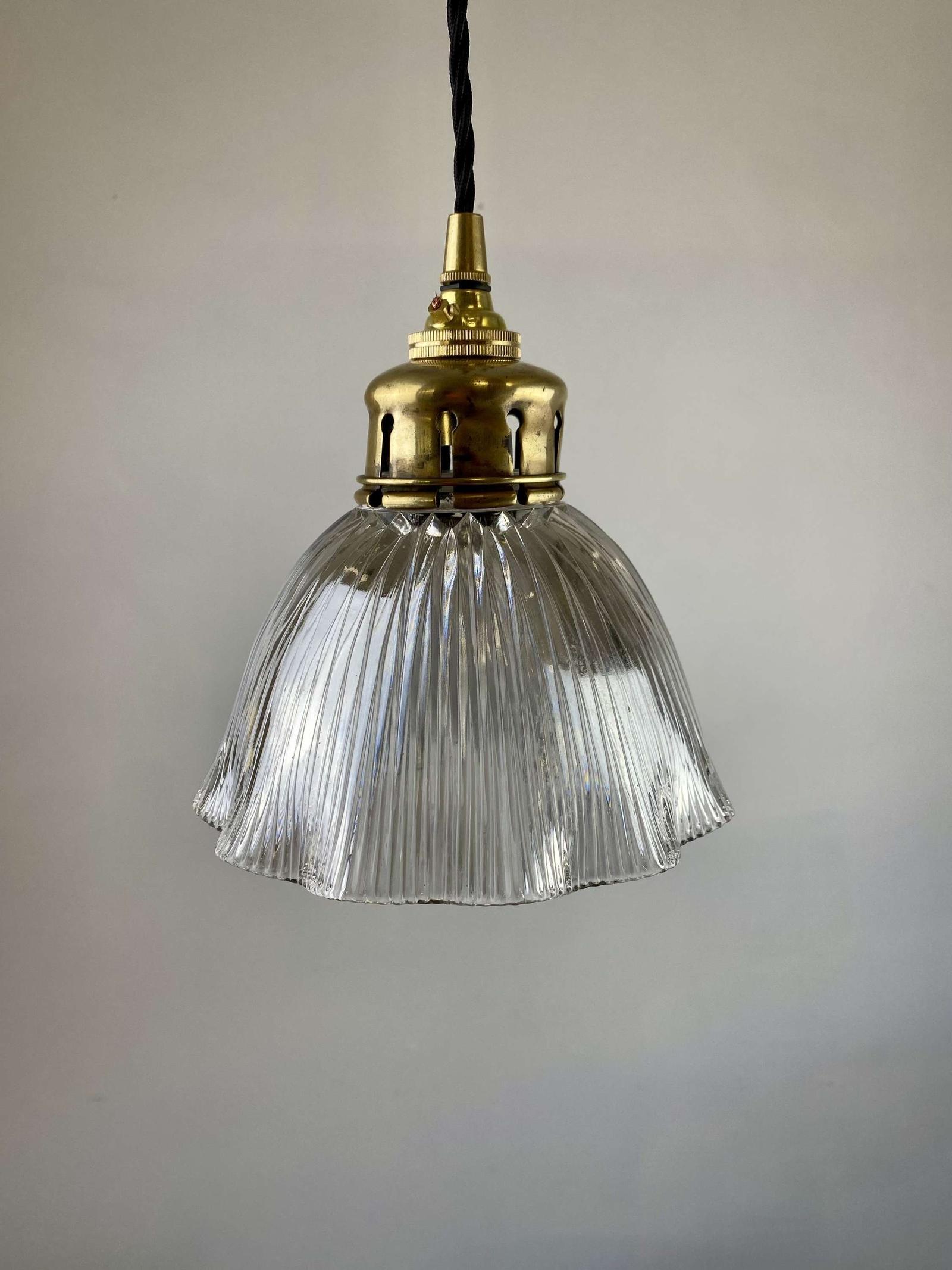 Prismatic genuine Holophane Glass shade with a pretty frilled edge. This shade dates back to the very early 20th century. Fitted with the original brass gallery. Stamped holophane on the rim.