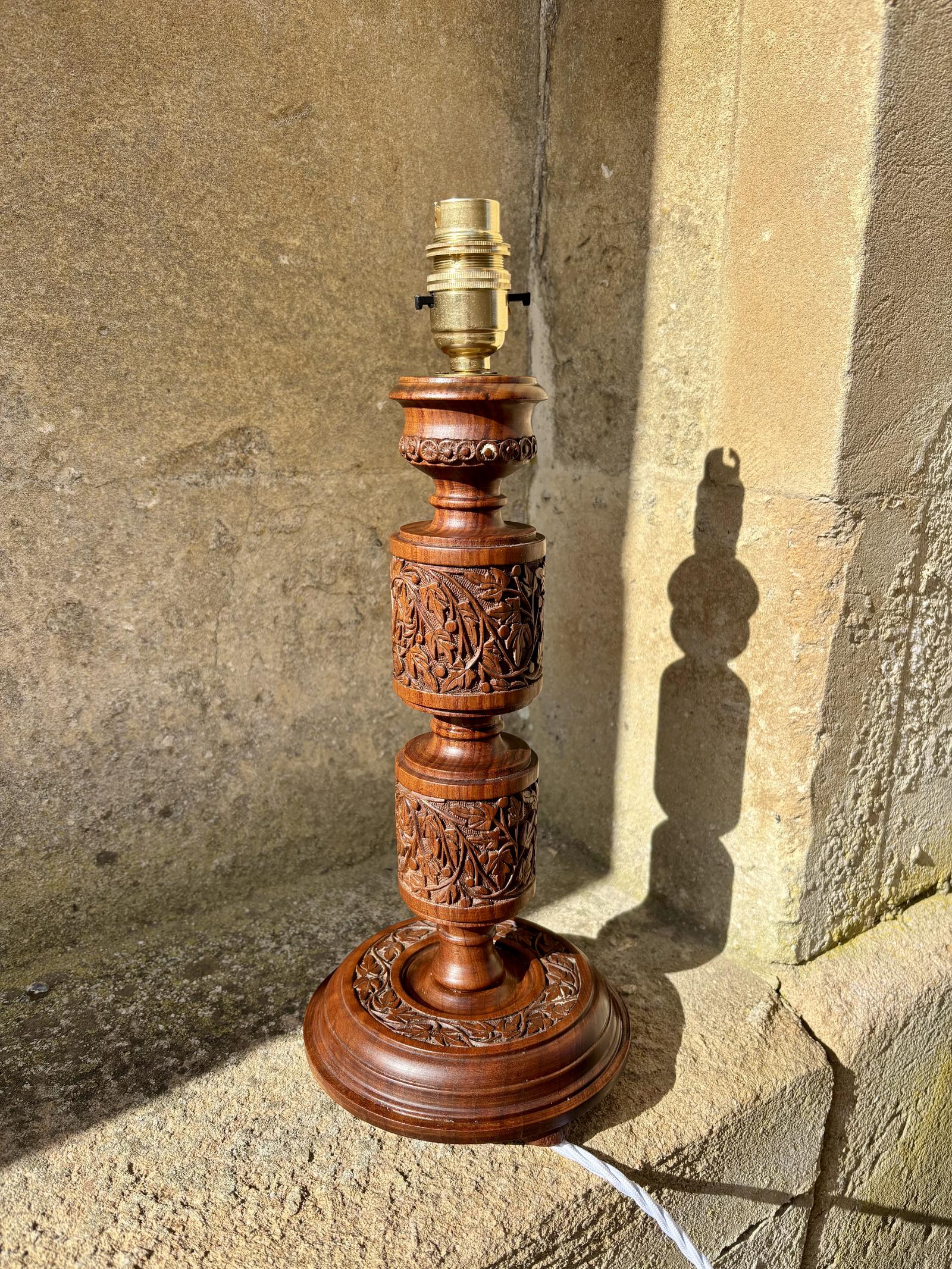 A beautifully crafted Kashmiri table lamp, hand-carved from solid wood and rich in traditional detail. This striking piece features intricate floral and foliate carving throughout the stem and base, showcasing the skilled craftsmanship for which Kashmiri woodwork is renowned.