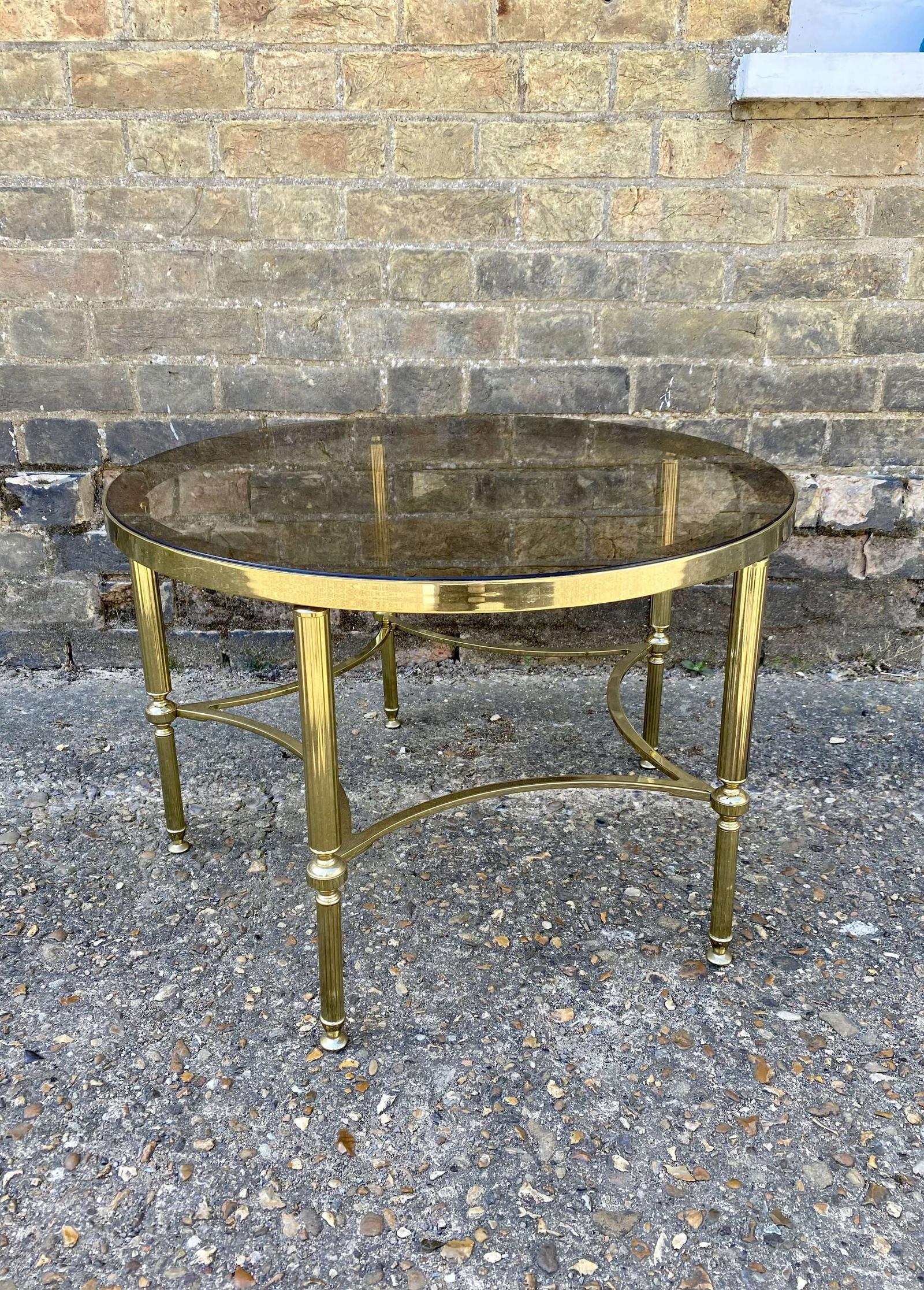 20th Century circular brass and glass coffee table. The glass top raised on reeded brass legs with a concave stretcher formation. Condition is good for age, with a couple of knocks on the glass.